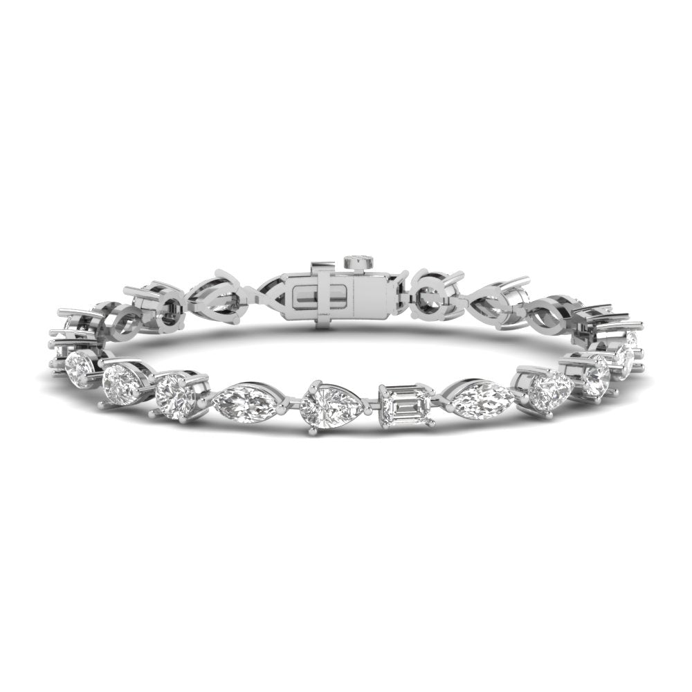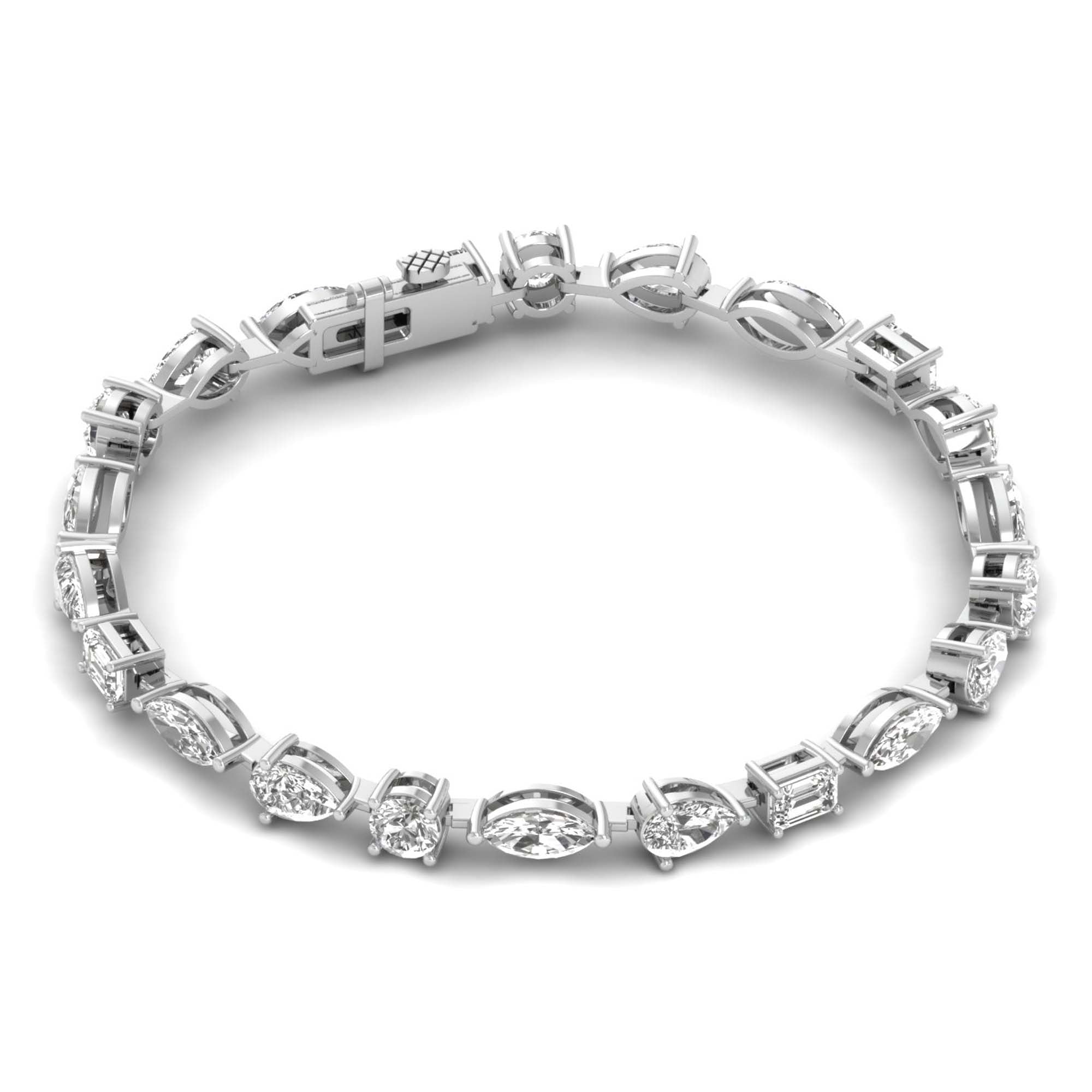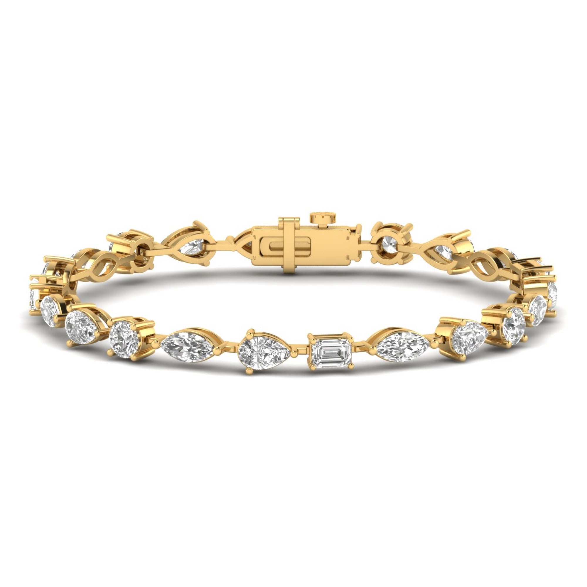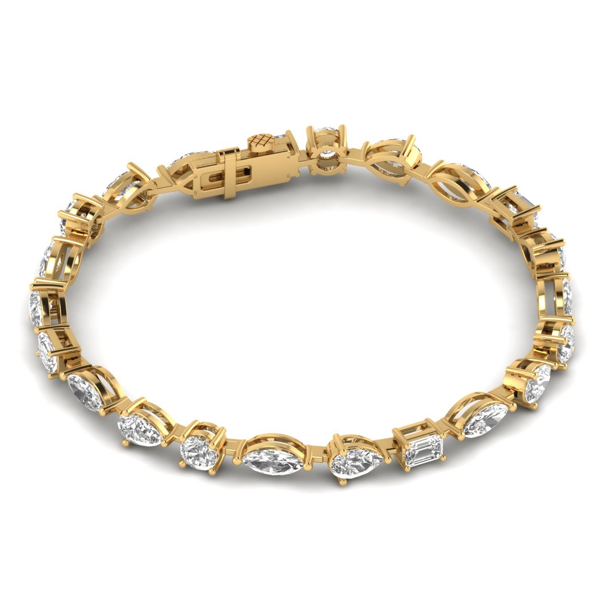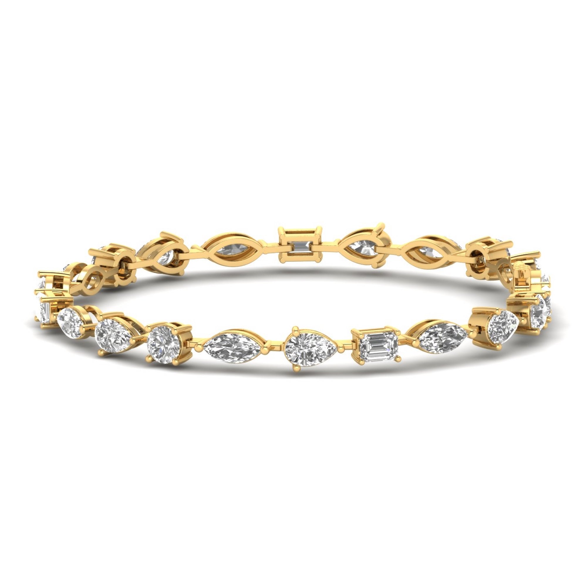 An exquisite expression of elegance, this 6.92-carat diamond bracelet features a harmonious blend of oval, marquise, pear, and emerald-cut diamonds, gracefully set in luxurious gold. The alternating diamond shapes create a captivating rhythm of brilliance, enhanced by the delicate openwork design that adds a touch of sophistication and airiness. Secured with a refined clasp, this bracelet is a true embodiment of timeless beauty, perfect for both special occasions and everyday luxury.