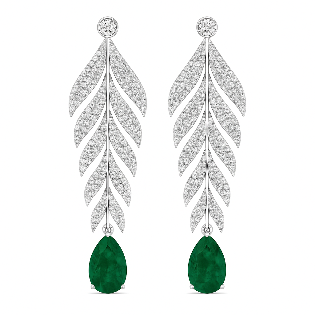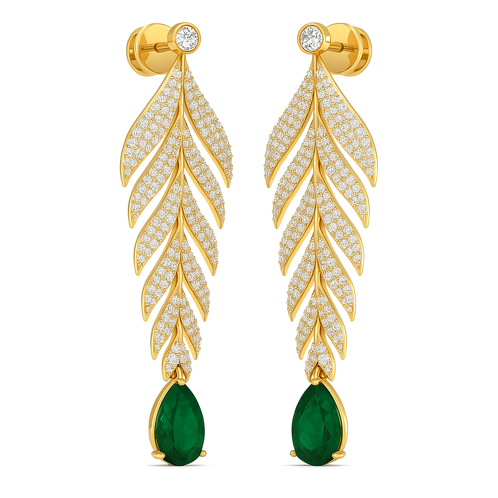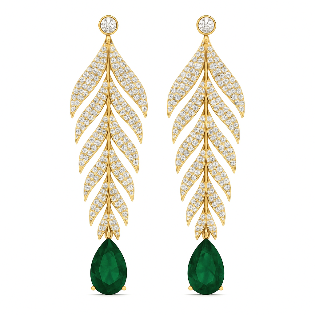 Make an unforgettable impression with these Regal Feather Earrings, a stunning blend of bold sophistication and timeless beauty. Featuring a total diamond weight of 3.79 carats, each earring showcases an exquisite cascading feather design, adorned with brilliant pavé-set diamonds, leading to a striking pear-cut ruby drop. The delicate movement and impeccable craftsmanship create a breathtaking interplay of light and color, making these earrings the perfect statement piece for high-end parties, celebrations, and grand occasions. Crafted in gold, they offer unparalleled brilliance, durability, and comfort, ensuring that you shine effortlessly in every moment.