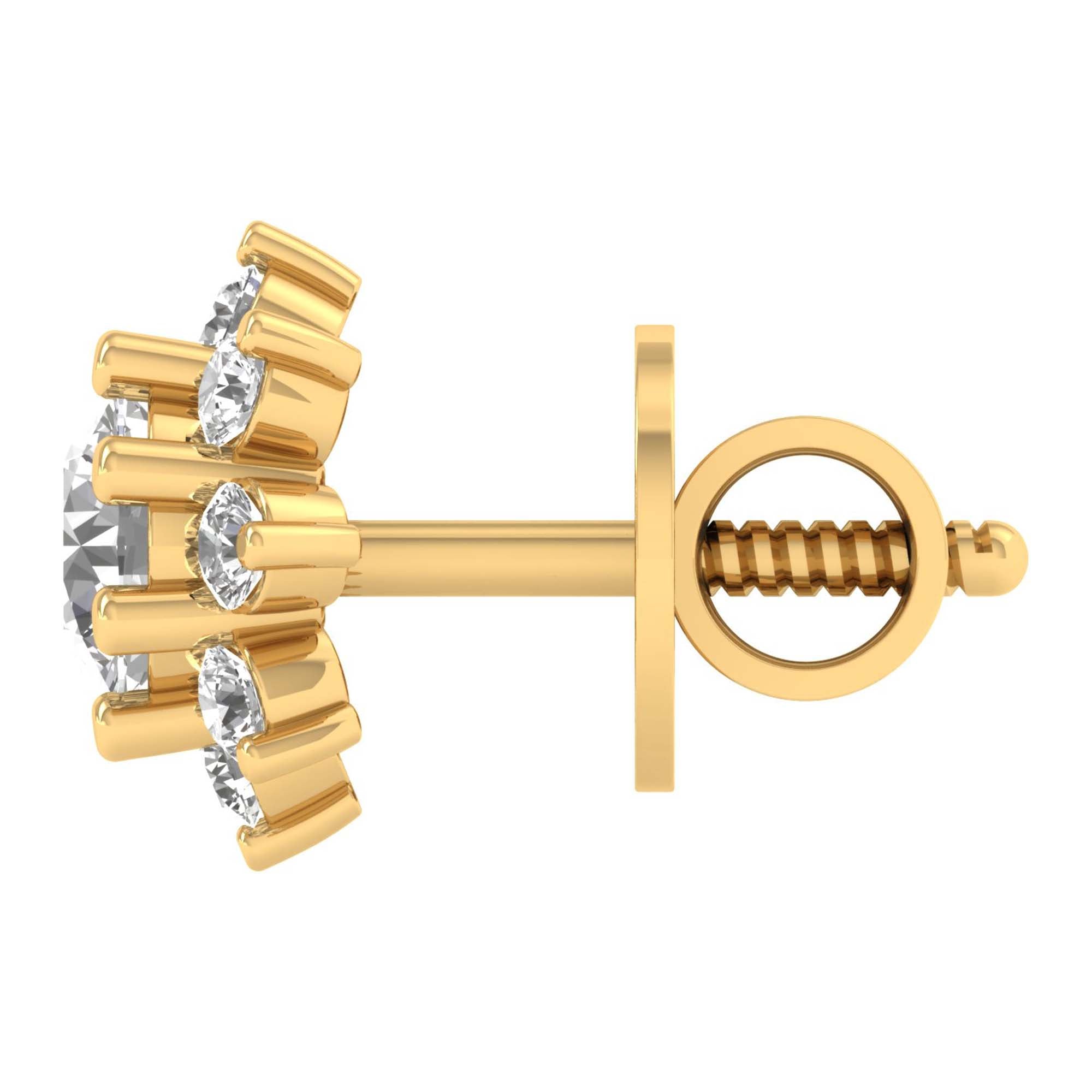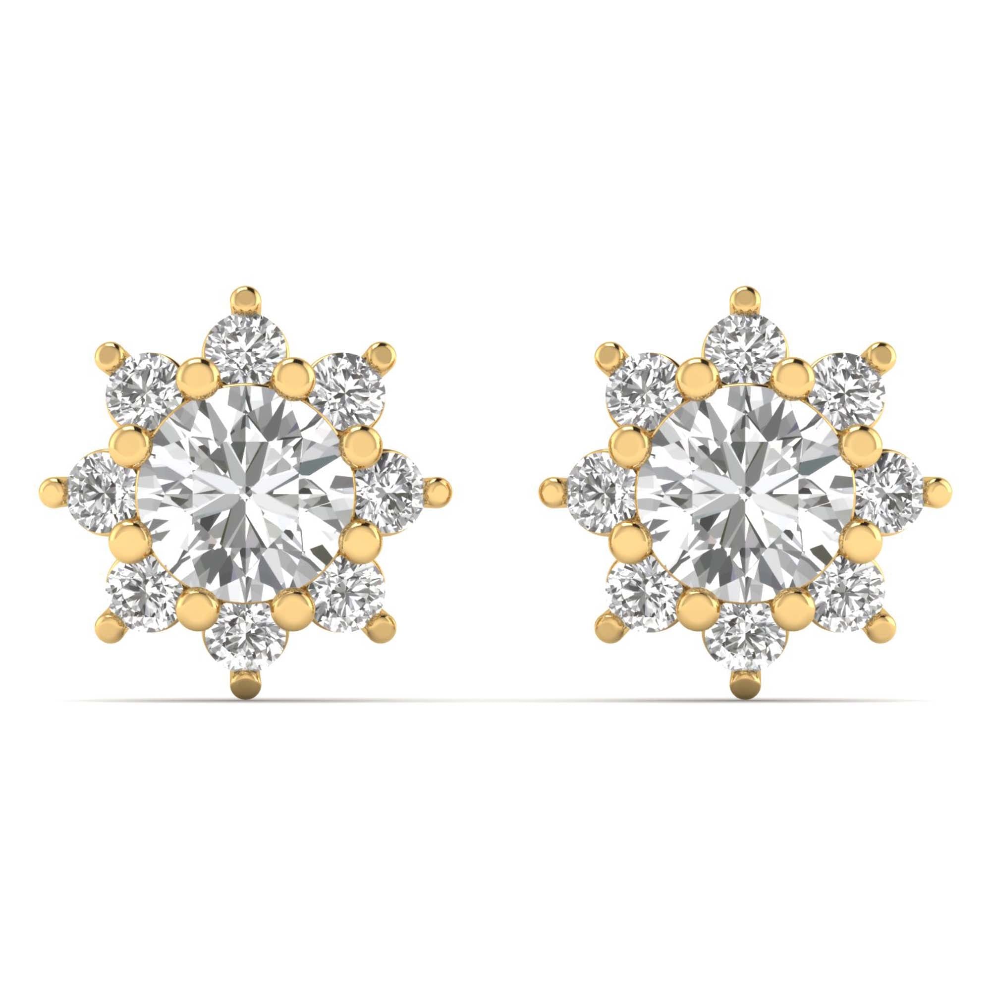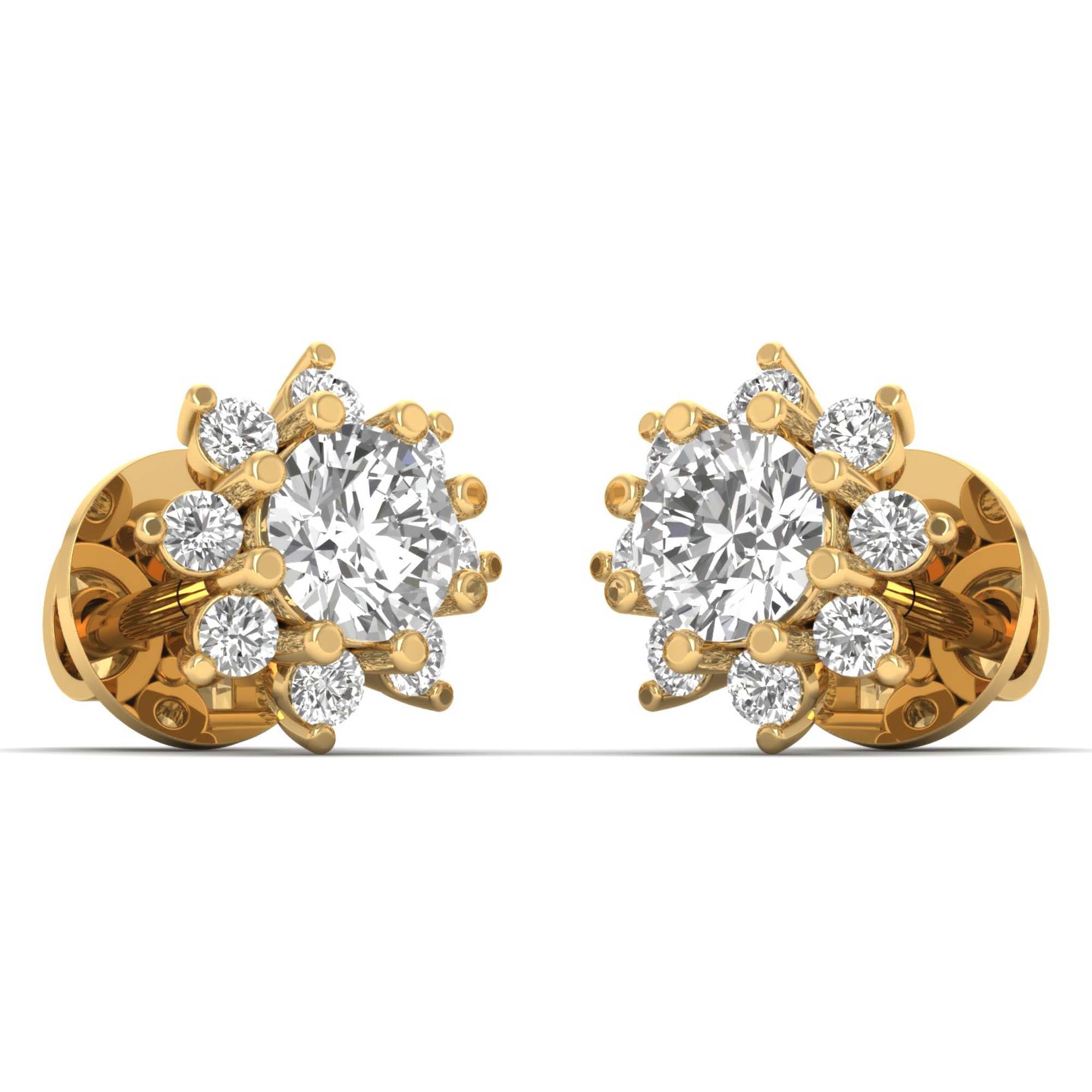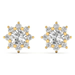 The Solara Bloom Studs capture the essence of radiant beauty and timeless sophistication. Featuring a total diamond weight of 1.53 carats, these exquisite earrings showcase a brilliant round-cut center diamond, surrounded by a halo of meticulously set diamonds, creating a mesmerizing floral-inspired burst. Set in polished yellow gold, this design offers lightweight comfort and exceptional sparkle, making them the perfect choice for everyday luxury or special occasions. Whether worn casually or as a statement of elegance, these earrings exude refined brilliance and effortless charm.